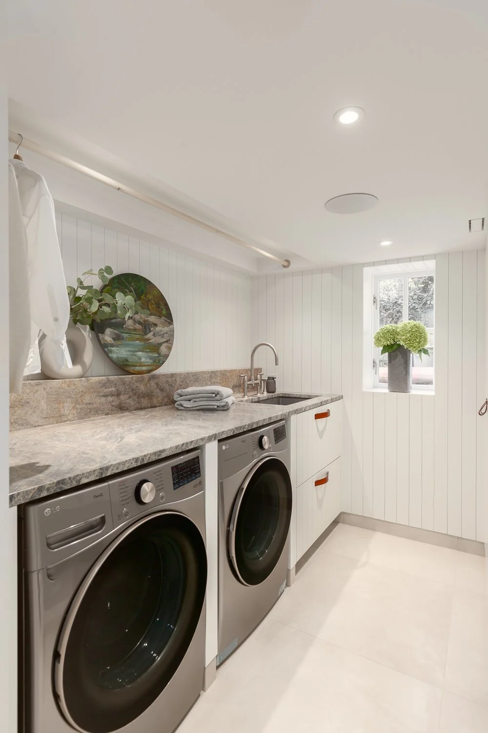 To bring personality to a typically utilitarian space, we chose a Holbord bridge kitchen faucet with side spray from House of Rohl. Its sculptural form makes the laundry room feel intentional and thoughtfully designed.